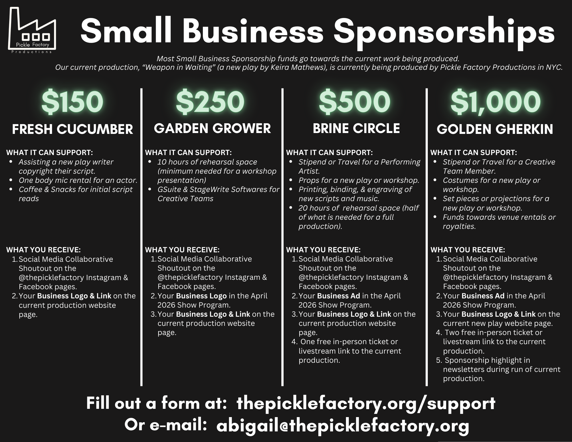 Pickle Factory Productions is currently working towards 501(c)3 status. Stay tuned to our social media and website as we announce the news!